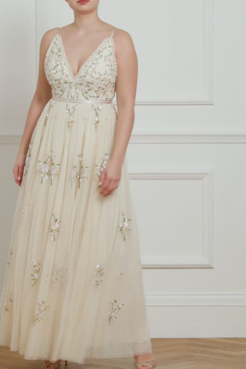 The Petunia Gown in Champagne. Inspired by Edwardian vintage artwork, this elegant gown is made up of scattered, richly embroidered bouquets of delicate florals in soft, pastel shades and subtle, vibrant green highlights. Shimmering iridescent sequins scattered throughout add a glistening effect to the piece. Intricately cut with fine, delicate tulle ruffles trimming the neckline, and a voluminous skirt that features a net under layer to subtly hold the shape, creating a truly romantic silhouette. Pair with the Petunia Cape for a statement look.