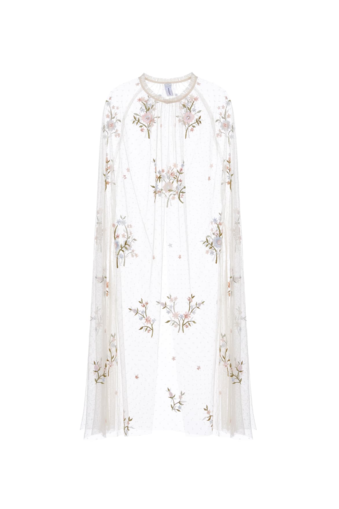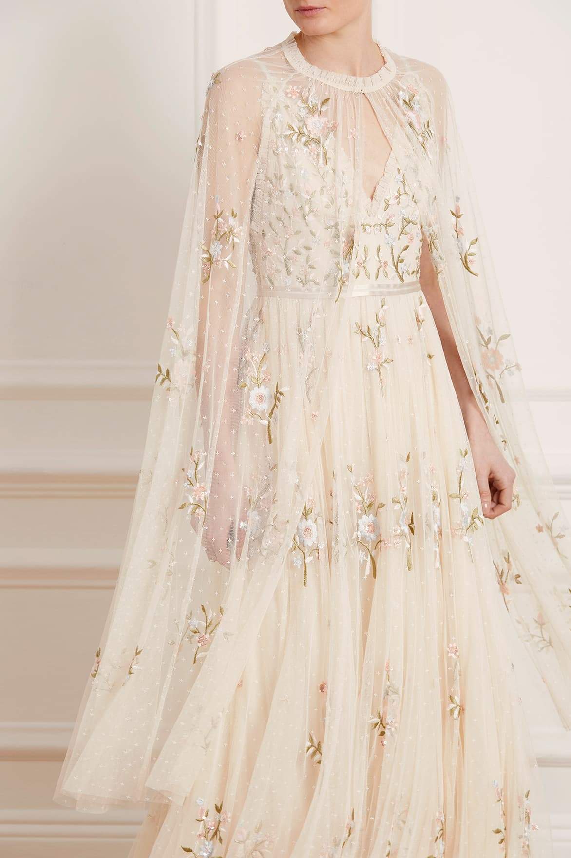 The Petunia Midaxi Cape in Champagne. Inspired by Edwardian vintage artwork, this elegant cape is made up of scattered, richly embroidered bouquets of delicate florals in soft, pastel shades and subtly vibrant green highlights. Shimmering iridescent sequins scattered throughout add a glistening effect to the piece. Intricately cut with fine, delicate tulle ruffle trimming and a relaxed shape, creating a truly romantic silhouette.