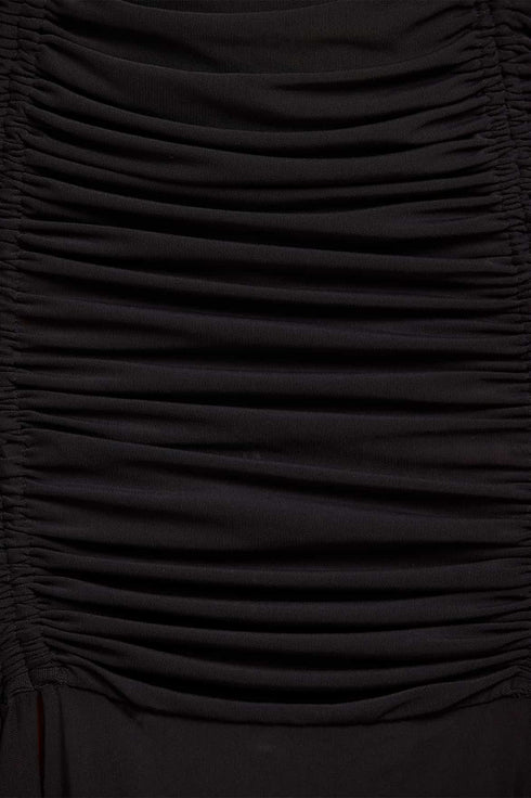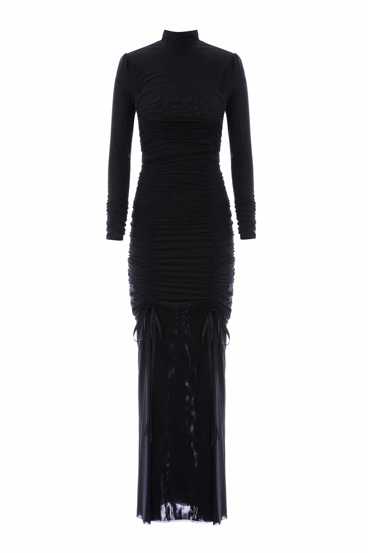NEW SEASON. The Phoebe Turtleneck Gown in Jet Black. Minimalist yet romantic, this showstopping gown embodies celestial sophistication. With a high neckline and slim silhouette, this piece exudes quiet confidence. The flowing skirt nods to timeless Victorian elegance, while the black tone captures the mystery of night skies; a gown for refined, modern romance.