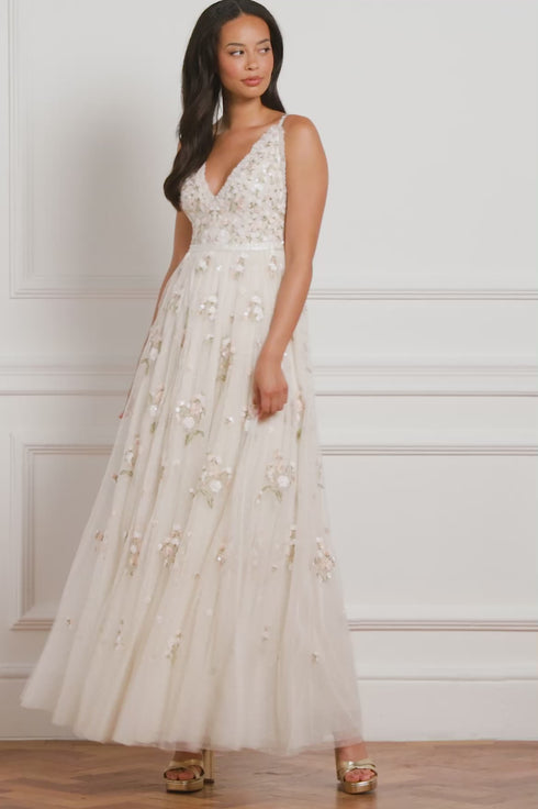 The Posy Bodice Cami Gown in Cream. The bodice of this gown is adorned beautifully with clusters of intricate floral bouquets and shimmering sequins for a sparkling effect. The skirt is developed with layers of signature Needle & Thread soft tulle for a romantic look. A simple but yet striking gown you'll forever treasure.
