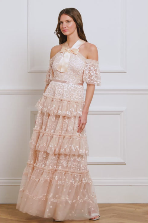 The Primrose Gown in Apricot is a classic Needle & Thread design inspired by Victorian styling. Featuring a statement satin ribbon bow, delicate floral embroidery, and perfectly layered tulle frills on the skirt, this gown is a timeless and elegant piece.