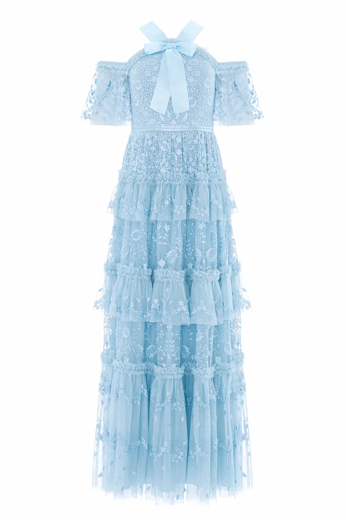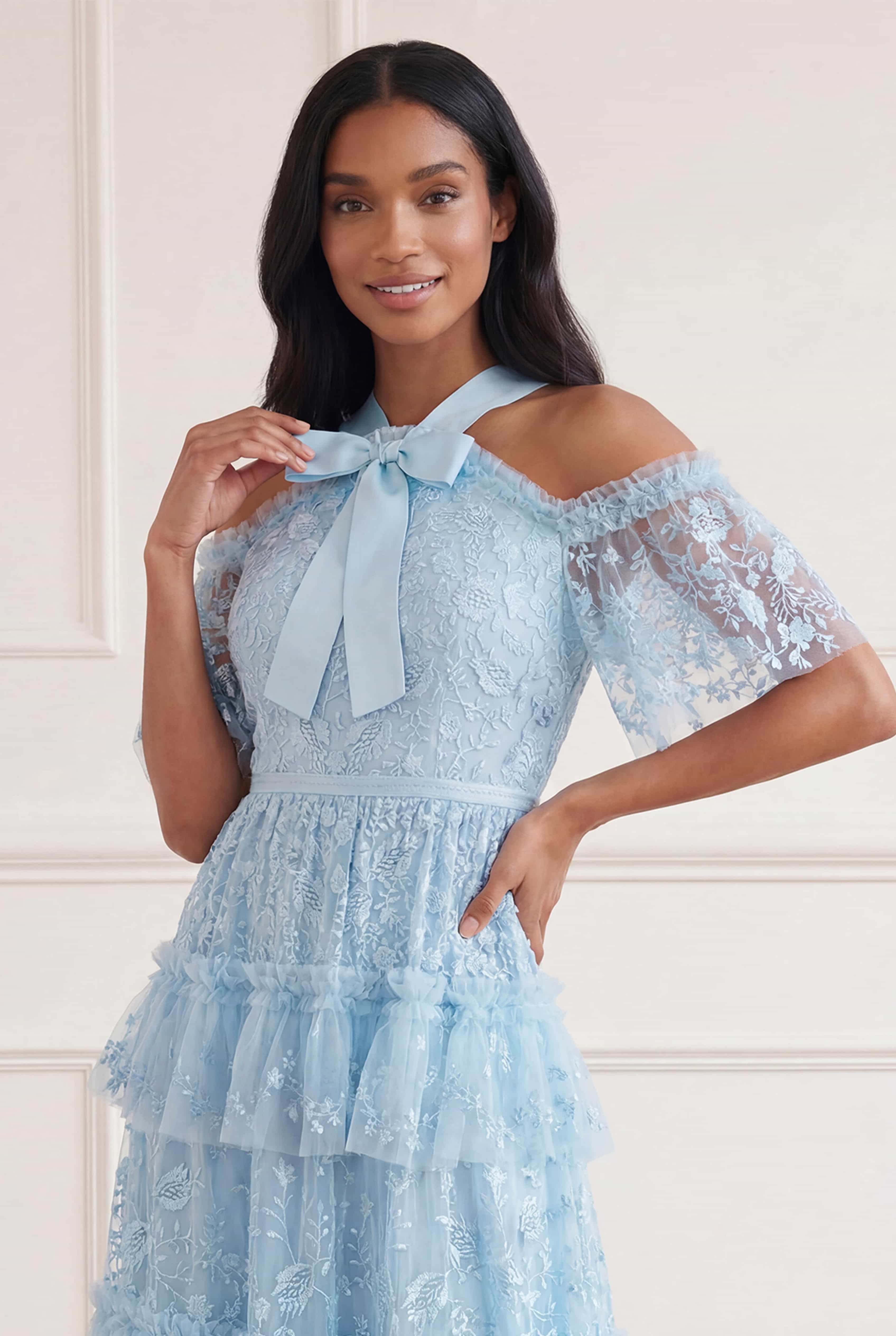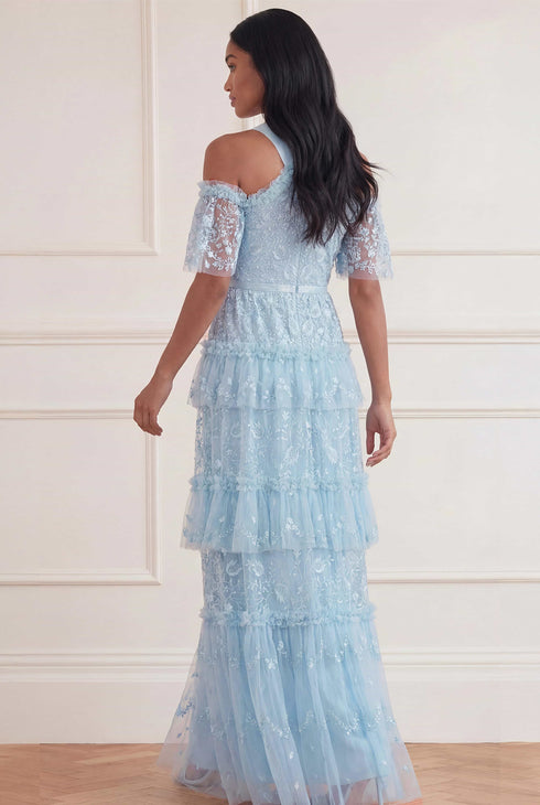 NEW SEASON. The Primrose Gown in Aqua. Inspired by the delicate beauty of primrose florals and summer sunsets, this full-length gown embodies timeless femininity. The softly sculpted bodice flows into an elegant skirt that moves with ease and grace.