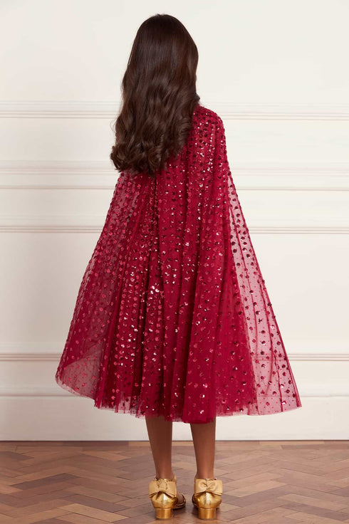 NEW SEASON. The Raindrop Cape Kids Dress in Red. Embroidered with sequins that scatter like falling stars, the gown features cape sleeves for dramatic effect and a flowing skirt for playful twirling. The red tone adds festive vibrancy, making it ideal for party season and celebrations. Pair with the Raindrop Cape Ankle Gown in Red from the adult collection for a coordinated look.