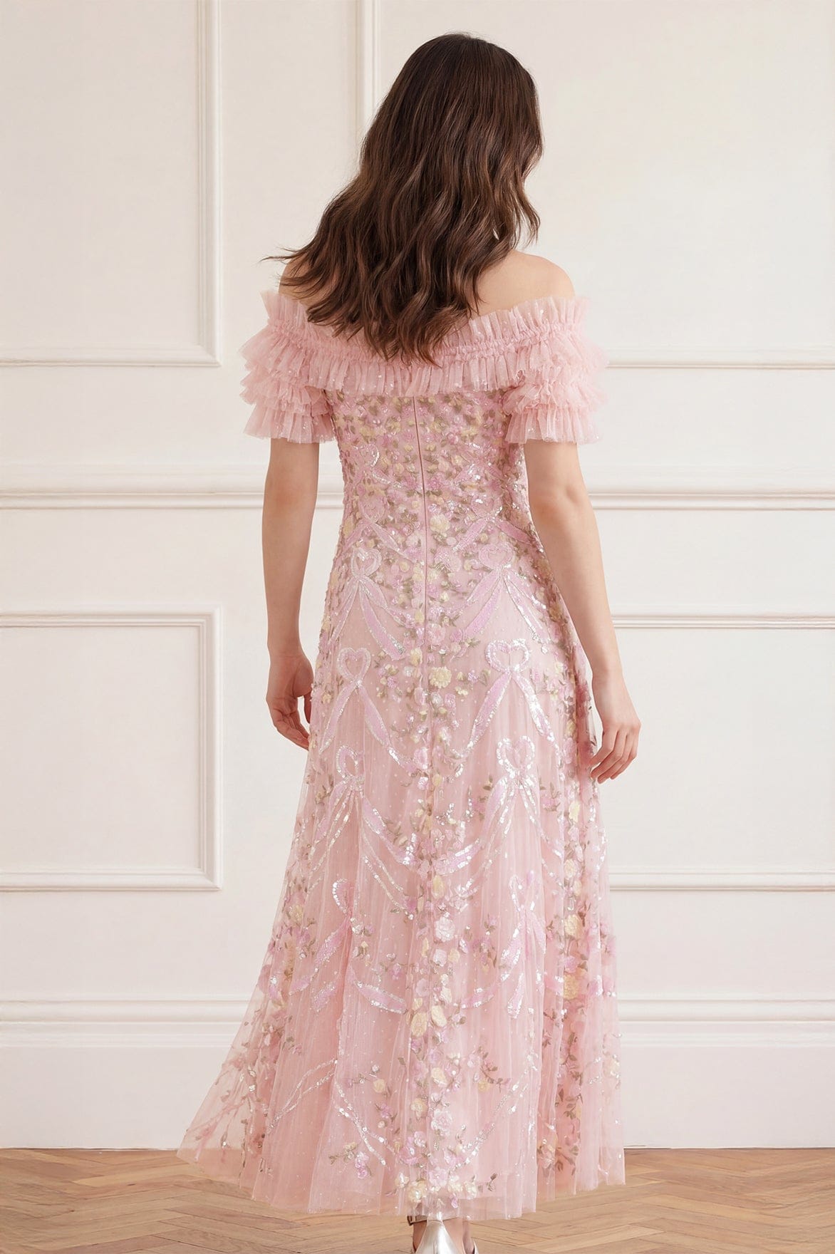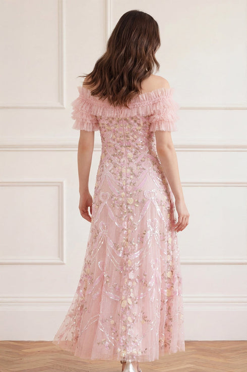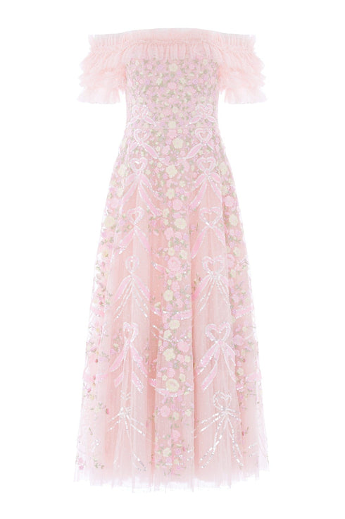 NEW SEASON. The Ribbon Heart Off-Shoulder Ankle Gown in Peony Pink/Multi. This romantic ankle-length gown features playful ribbon heart motifs inspired by whimsical garden details. Designed with an off-shoulder neckline and a softly flowing silhouette for feminine, statement occasionwear.