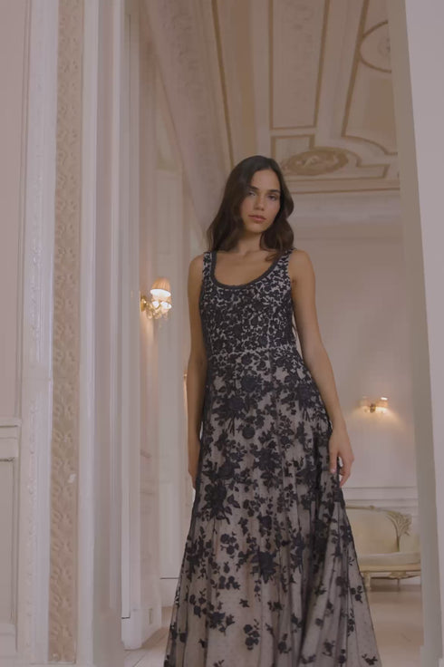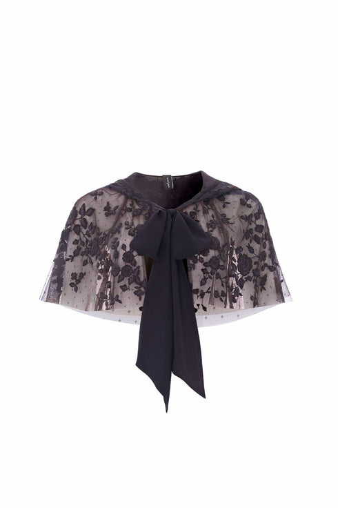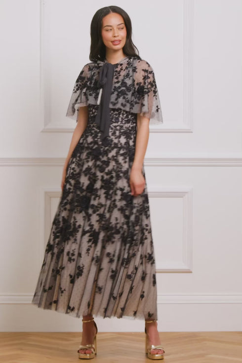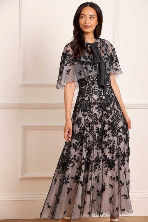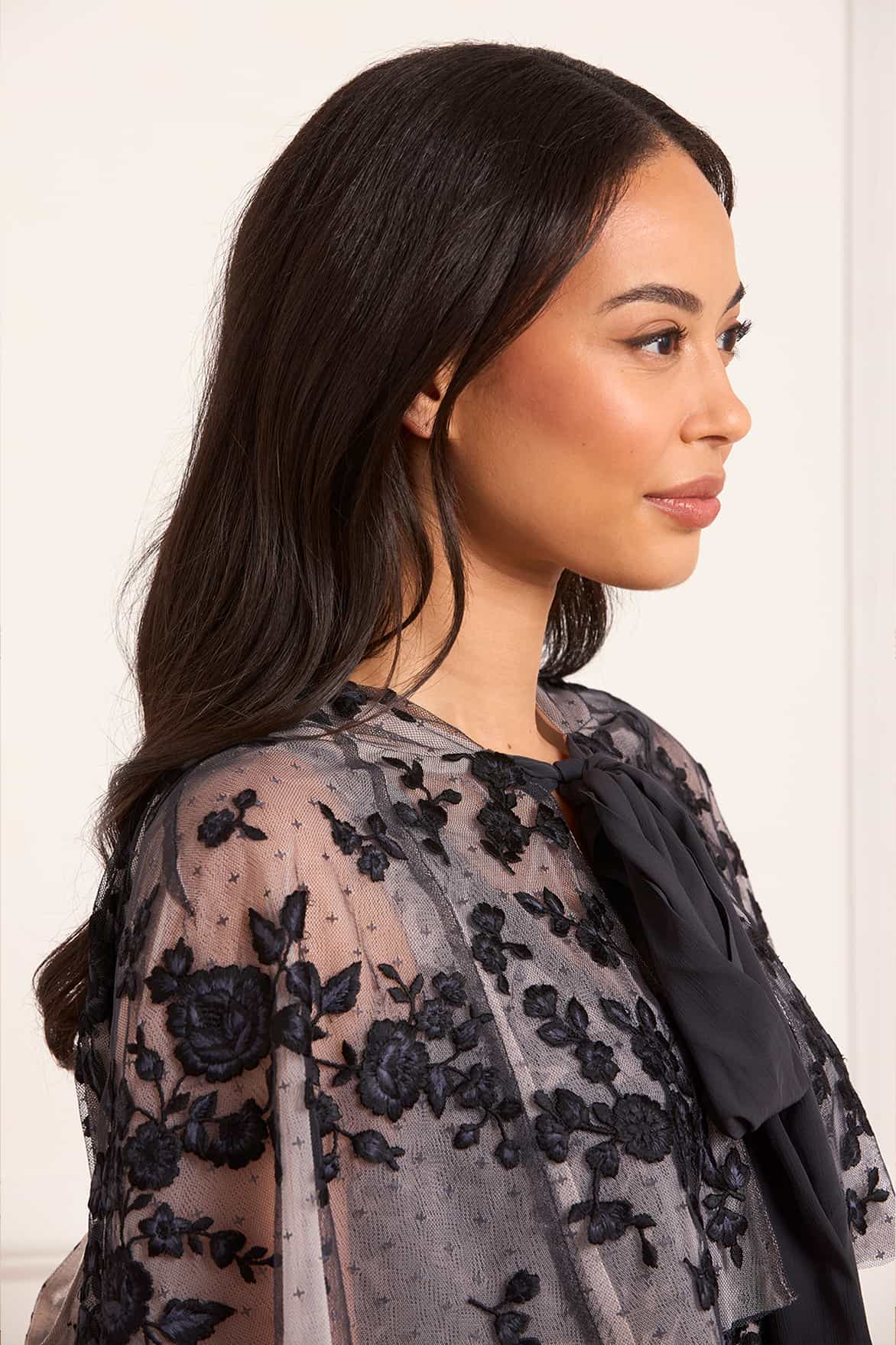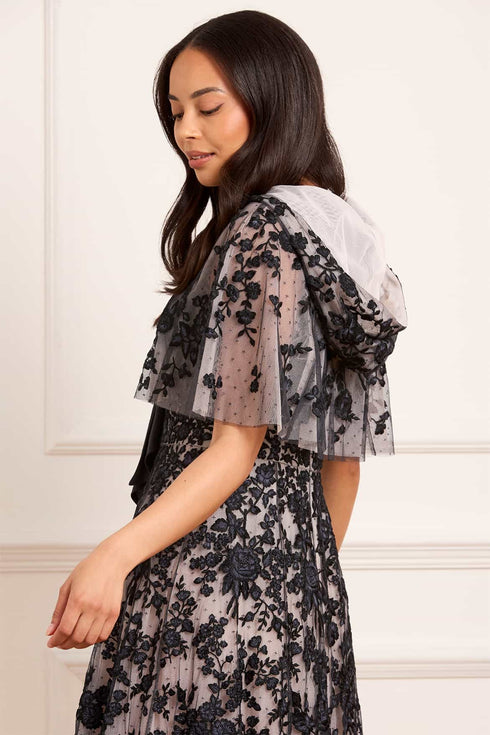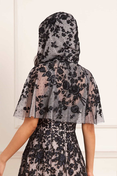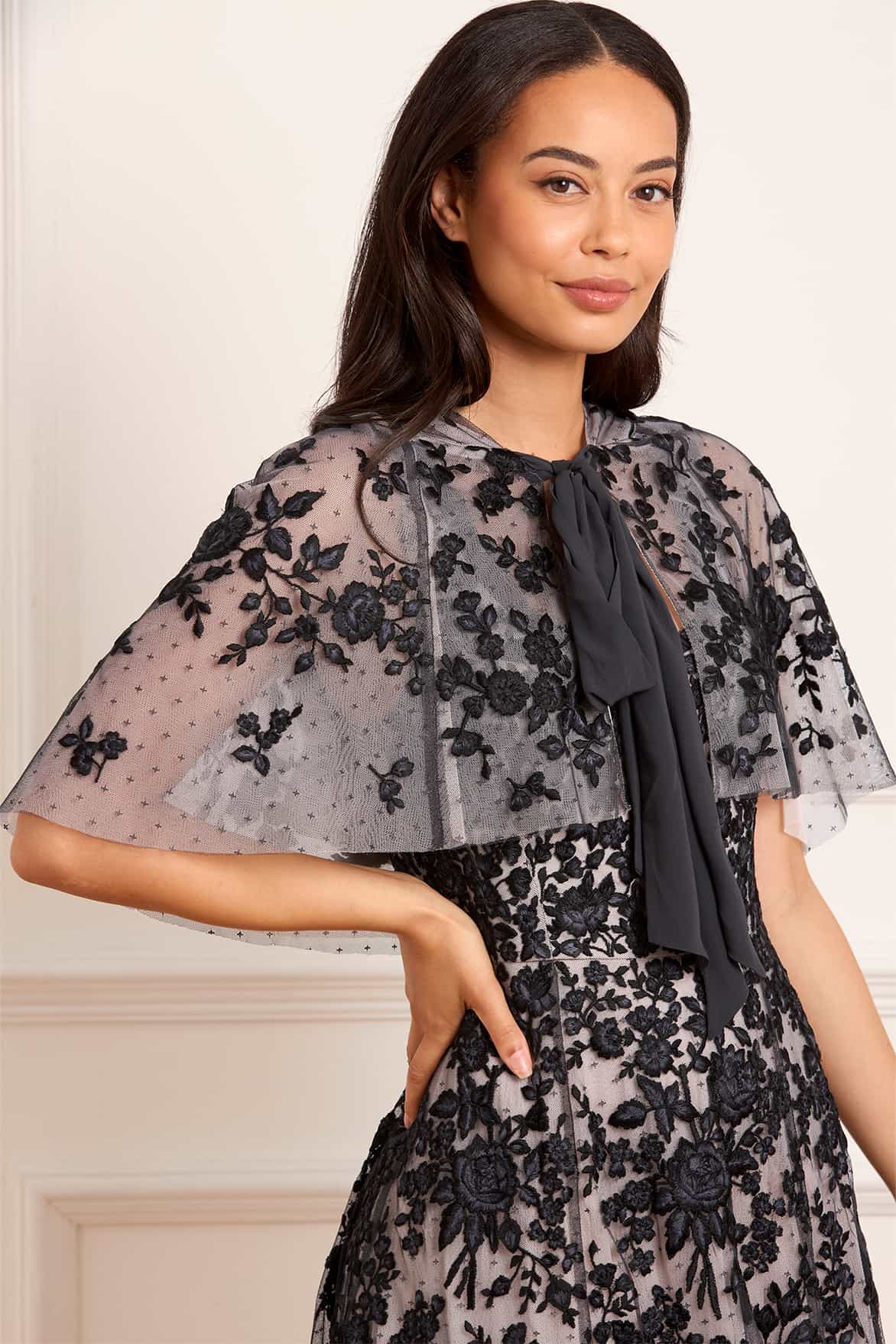 NEW SEASON. The Rosa Hooded Short Cape in Graphite/Opal. This cropped embroidered cape is designed to complement the matching Rosa Scoop Neck Ankle Gown. Adorned with bold rose and ditsy motifs, the cape fastens with a soft chiffon bow at the neckline. Perfect for making a dramatic and romantic statement.