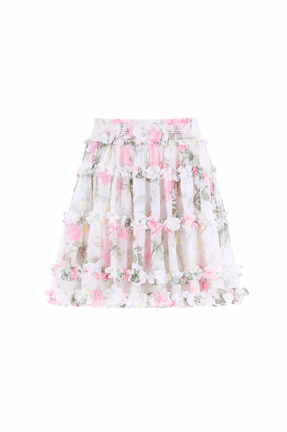 The Rose Chiffon Smocked Mini Skirt in Moonshine/Pink features a romantic print inspired by antique hand-painted artwork, with large rose blooms and trailing florals. Designed with a smocked waistband and signature Needle & Thread ruffles, the skirt has perfectly placed tiers and a voluminous, playful silhouette. Pair it with the matching top for a complete look.