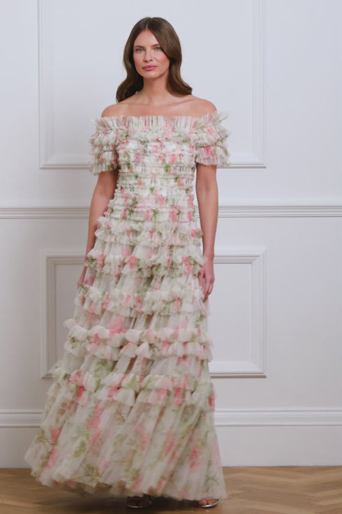 - Floral printed tulle decorated with layers of tulle ruffles.