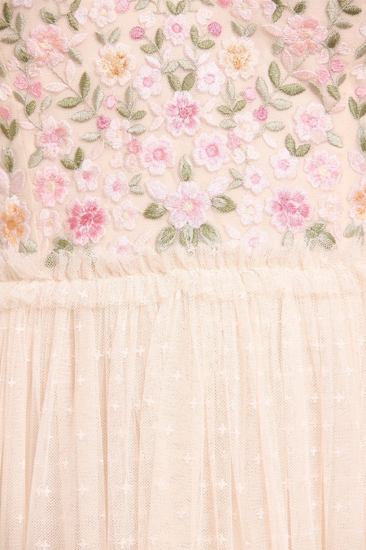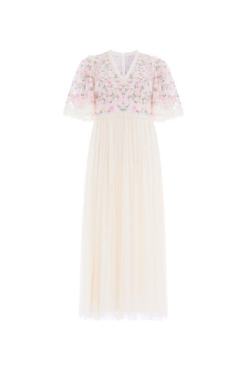 The Rosie Lace Bodice Short Sleeve V-Neck Ankle Gown in Cream/Multi features an intricately embroidered floral bodice, inspired by a 1930s vintage print. Beautifully designed with delicate lace-trimmed fluted sleeves and soft tulle ruffles at the waist and neckline add romantic detail. The layered tulle skirt creates an ethereal, graceful silhouette, making this gown perfect for any special occasion.