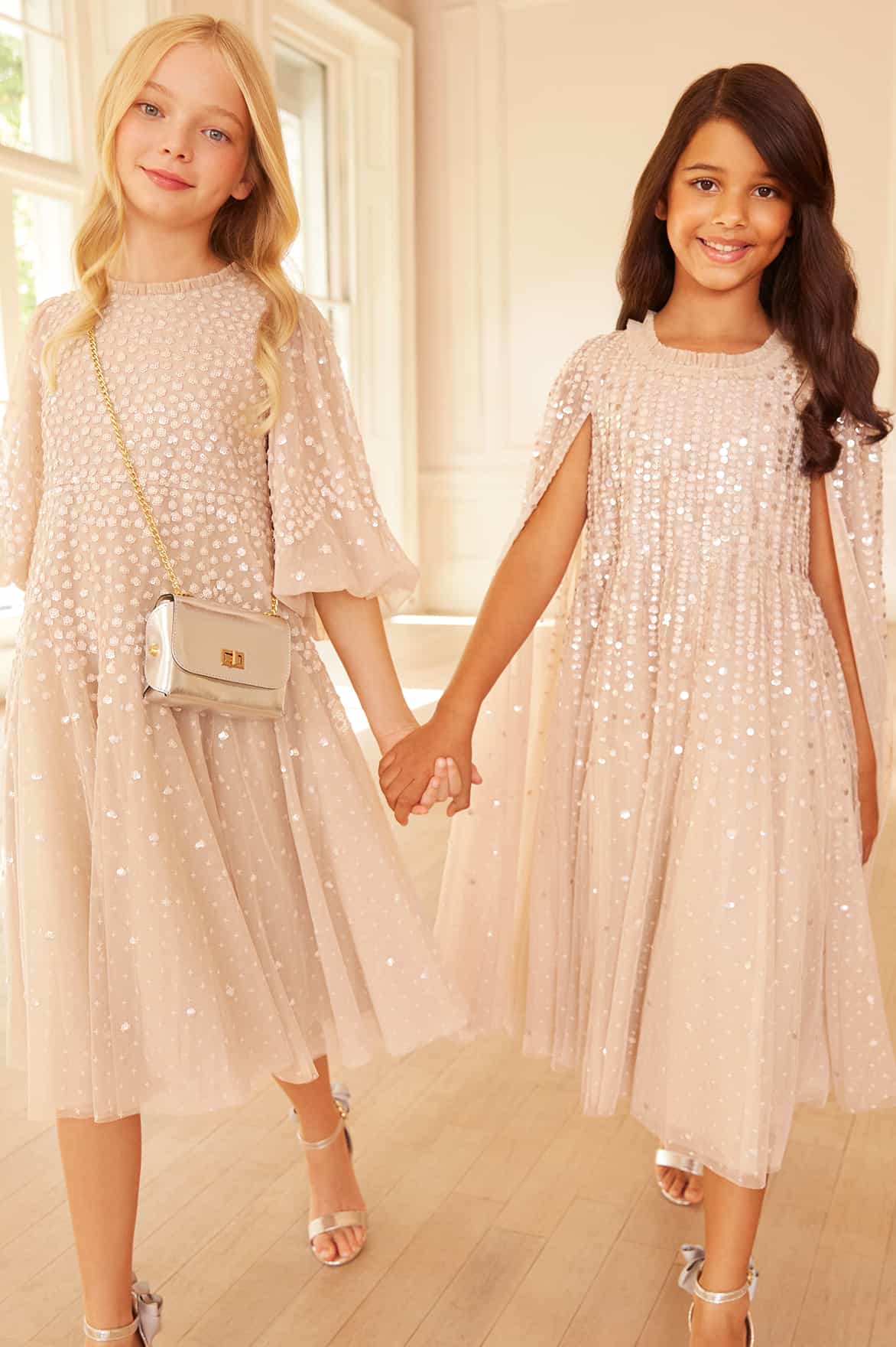 NEW SEASON. The Scallop Sequin Kids Dress in Oyster. A light, elegant piece crafted in layers of soft tulle. Sequin clusters form delicate scallop motifs across the bodice, adding shimmer and texture. The soft oyster shade makes it versatile and timeless. Designed to match the Scallop Sequin Round Neck Ankle Gown in Oyster from the womenswear collection, this dress completes a mother-and-daughter pairing.