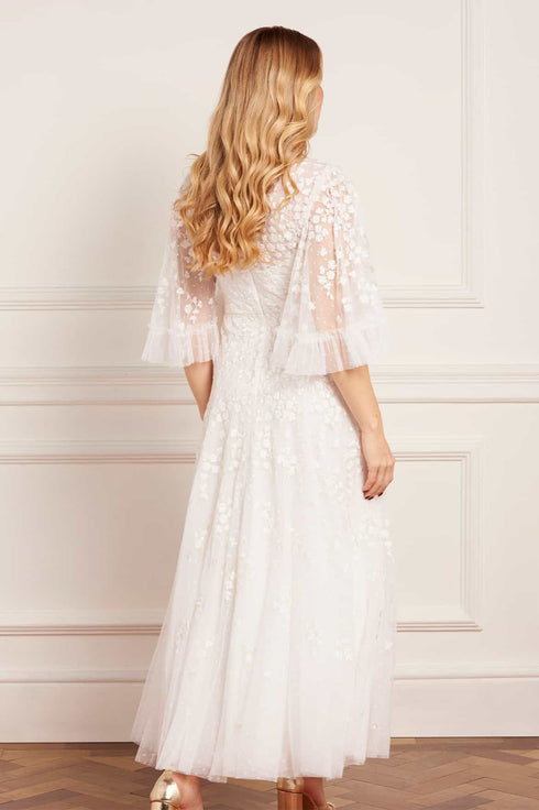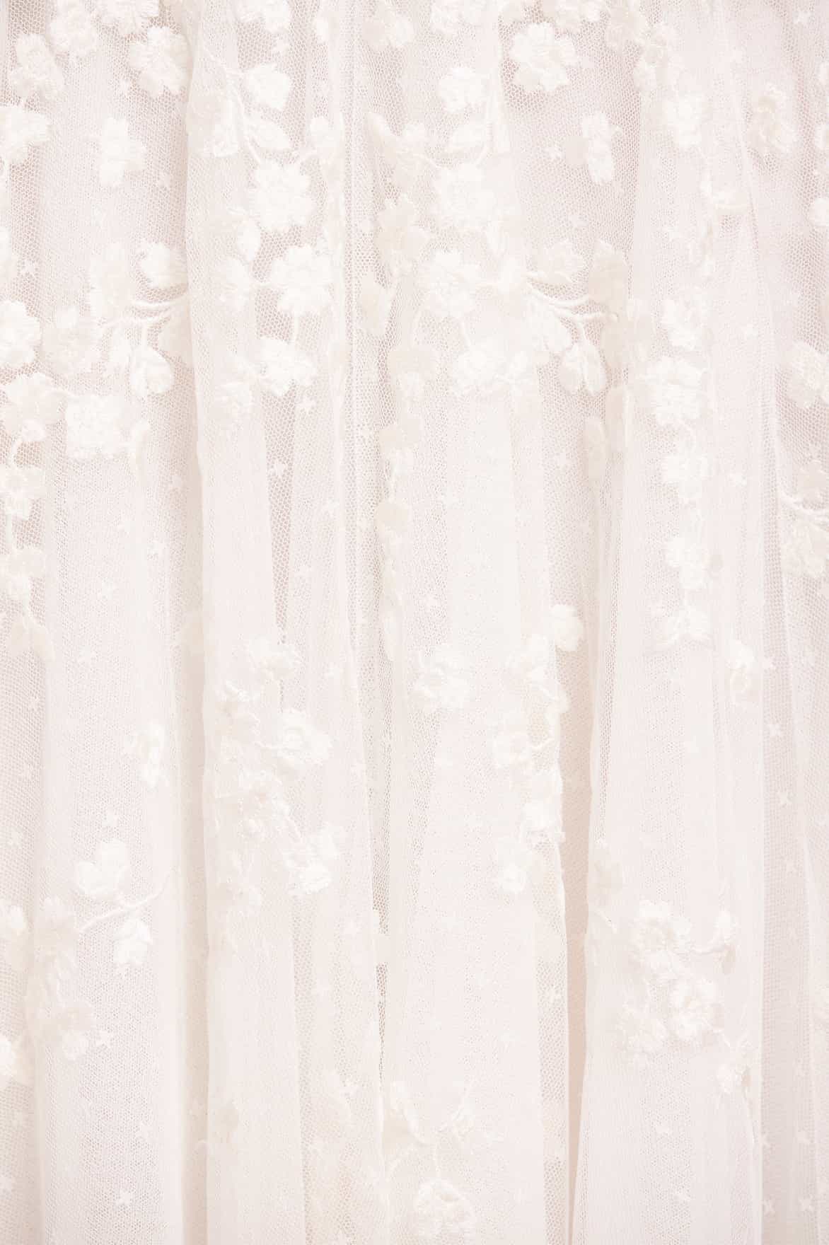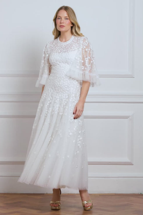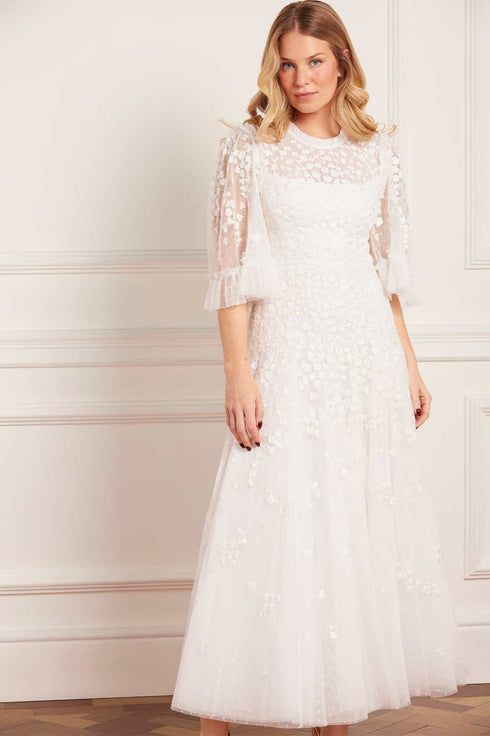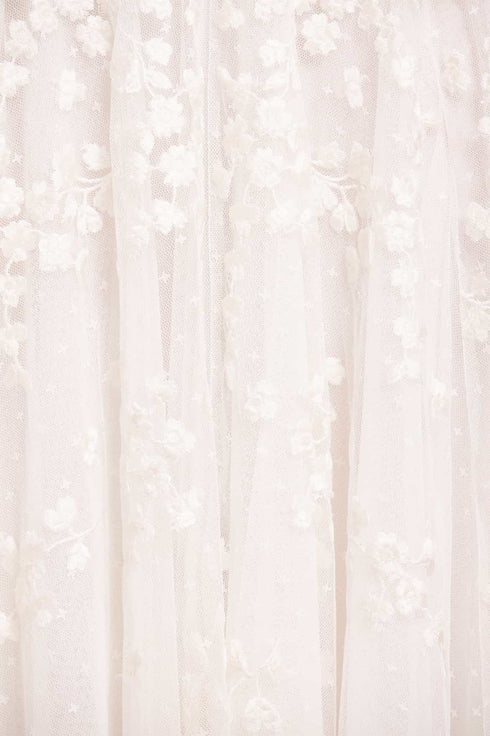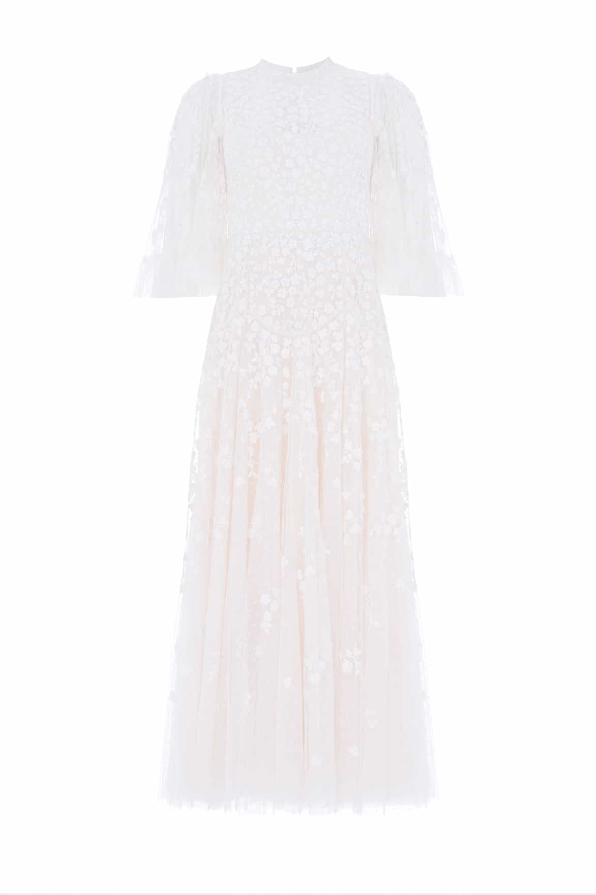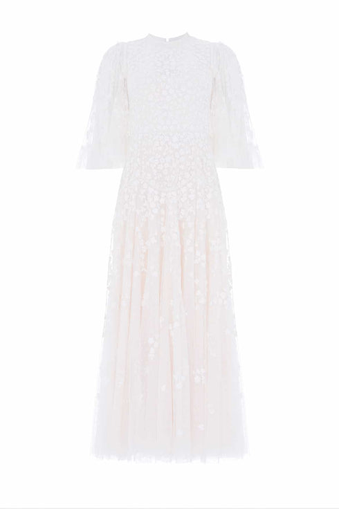 NEW SEASON | NEEDLE & THREAD EXCLUSIVE. The Scatter Blossom Round Neck Ankle Gown in Swan White. Embodies refined purity. Crafted from tulle with delicate ditsy embroidery, this gown offers an ethereal interpretation of romantic evening wear.