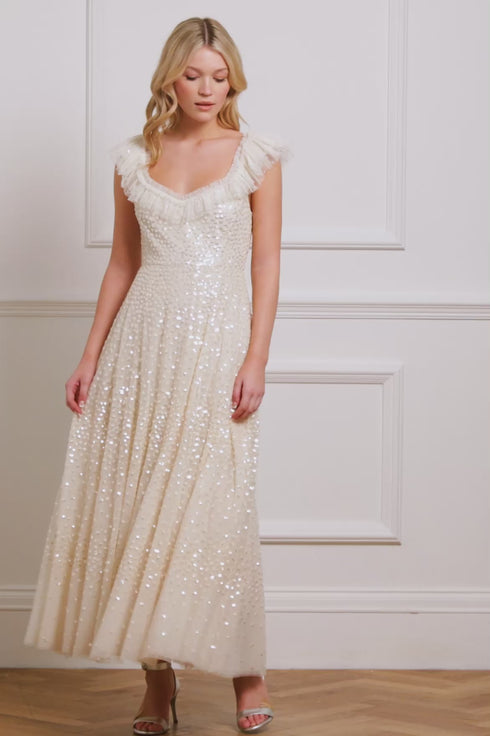 The Scatter Dot Ruffle Ankle Gown in Cream. This gown features shimmering dot motifs that fade towards the hem for a captivating glittering effect. The sequins have a high-shine finish, enhanced by a foil coating. Designed with a tulle frill edge on the neckline, while layered tulle sleeves add volume. The voluminous skirt, made from net and tulle, creates a sweeping hemline. This enchanting gown is perfect for any special occasion.