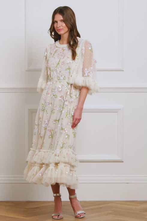 The Sequin Dandelion Gloss Ballerina Dress in Cream is inspired by Victorian botanical artist Marianne North. This dress features vibrant, shimmering dandelion floral sequins that delicately scatter towards the hem, creating a radiant effect. The sequins have a high-shine gloss finish, enhanced by a foil coating. With a loose, floaty silhouette and voluminous sleeves, this romantic dress is perfect for any special occasion.