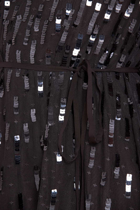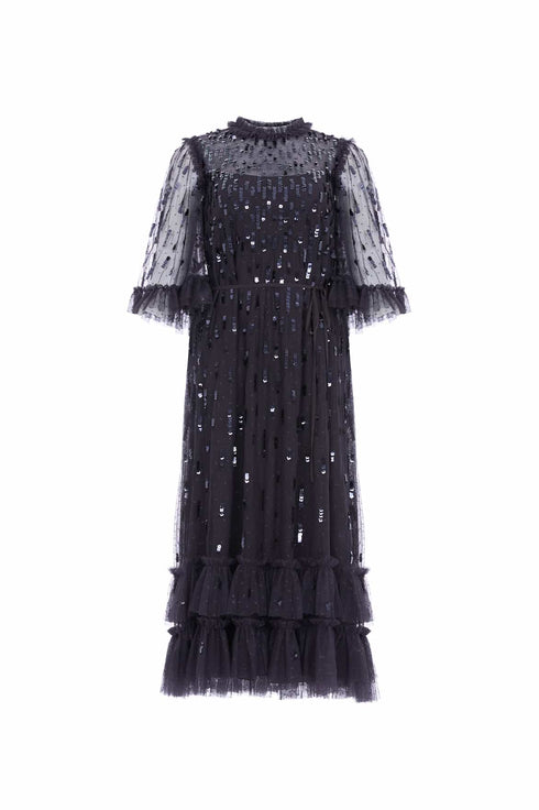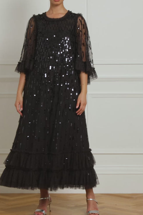 The Sequin Dash Ballerina Dress in Graphite. This ballerina length dress is adorned with statement, square sequins in a staggered linear layout creating a shimmer throughout. Developed with a loose silhouette for an effortless, floaty feel featuring voluminous sleeves for a romantic look. The perfect dress for an upcoming special occasion.