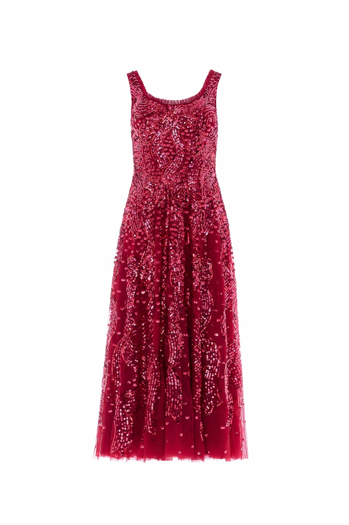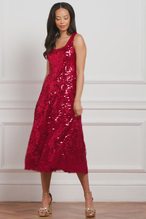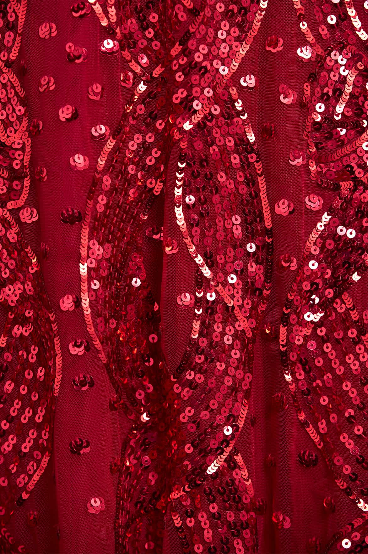 NEW SEASON. The Sequin Ribbon Scoop Neck Ballerina Dress in Red. Featuring a scoop neckline and ribbon sequin embroidery, the fitted bodice flows into a frothy ballerina skirt of layered tulle. The red palette enhances its vibrancy and bold spirit, making it a perfect choice for memorable evenings.