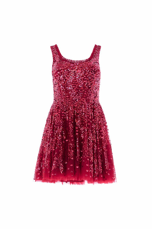 NEW SEASON. The Sequin Ribbon Scoop Neck Micro Mini Dress in Red. Sequined ribbon motifs shimmer across the fitted bodice and skirt, while the scoop neckline frames the silhouette with playful charm. In bold red, the dress embodies passion and festive spirit, perfect for statement-making evenings.