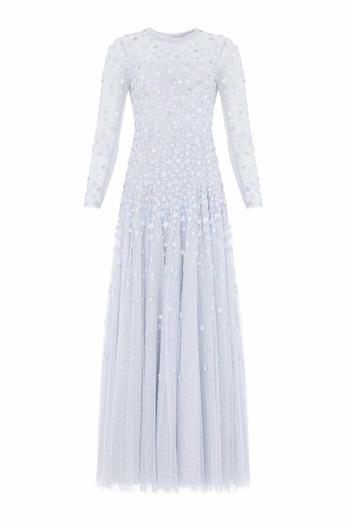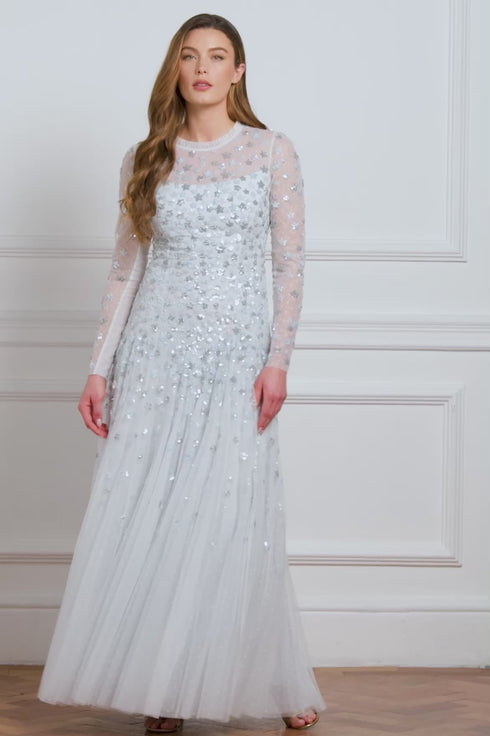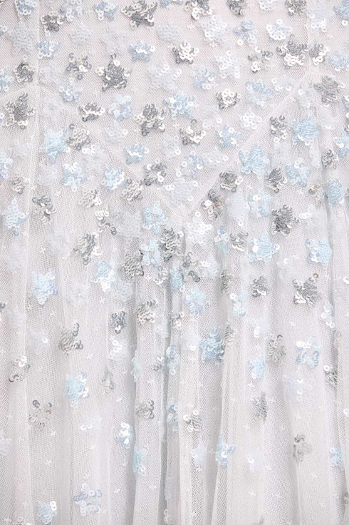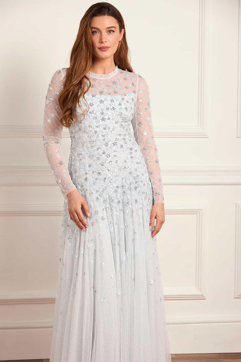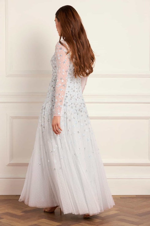 NEW SEASON. The Starry Nights Round Neck Gown in Ice Blue. Embellished with tiny sequin stars that cascade gracefully towards the hem. Designed with a soft round neckline and flowing skirt, this gown captures a celestial elegance for the modern romantic.