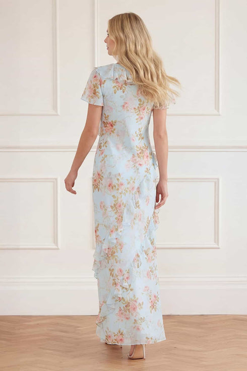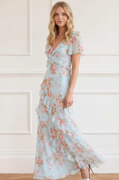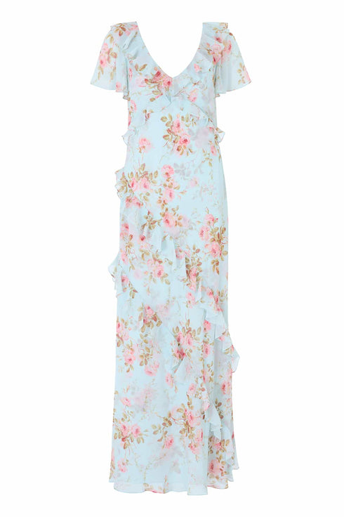 NEW SEASON | NEEDLE & THREAD EXCLUSIVE. The Summer’s Rose Georgette V-Neck Gown in Aqua. This elegant V-neck gown is adorned with the romantic Summer’s Rose floral print, capturing the warmth of the season’s final bloom. The flowing full-length silhouette creates graceful movement with a flattering, elongated shape.