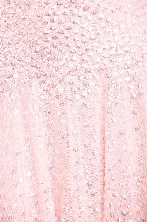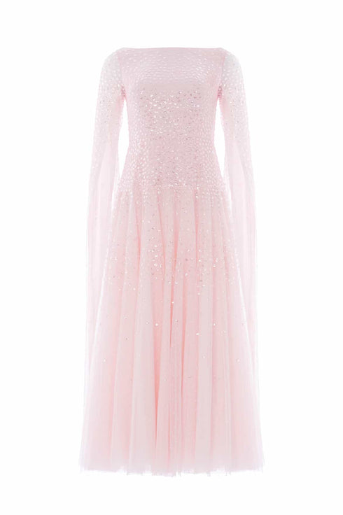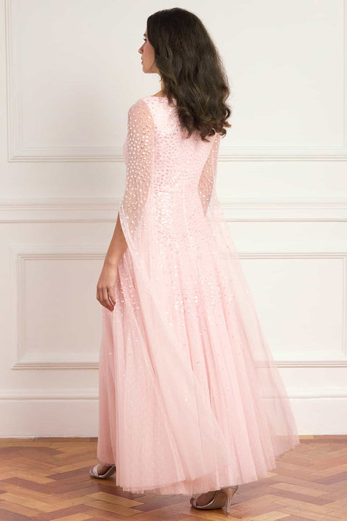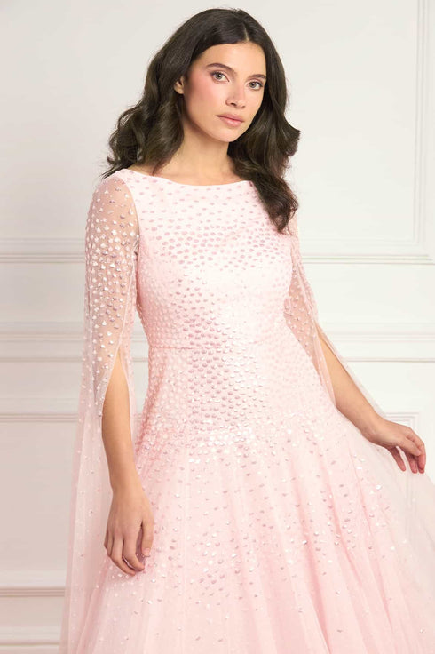 NEW SEASON. The Sunrise Sequin Cape Sleeve Ankle Gown in Peony Pink. Embellished with shimmering dot motifs arranged in softly fading linear bands, this gown captures a subtle sunrise-inspired glow. Designed with cape sleeves and an elegant ankle-length silhouette for refined eveningwear.