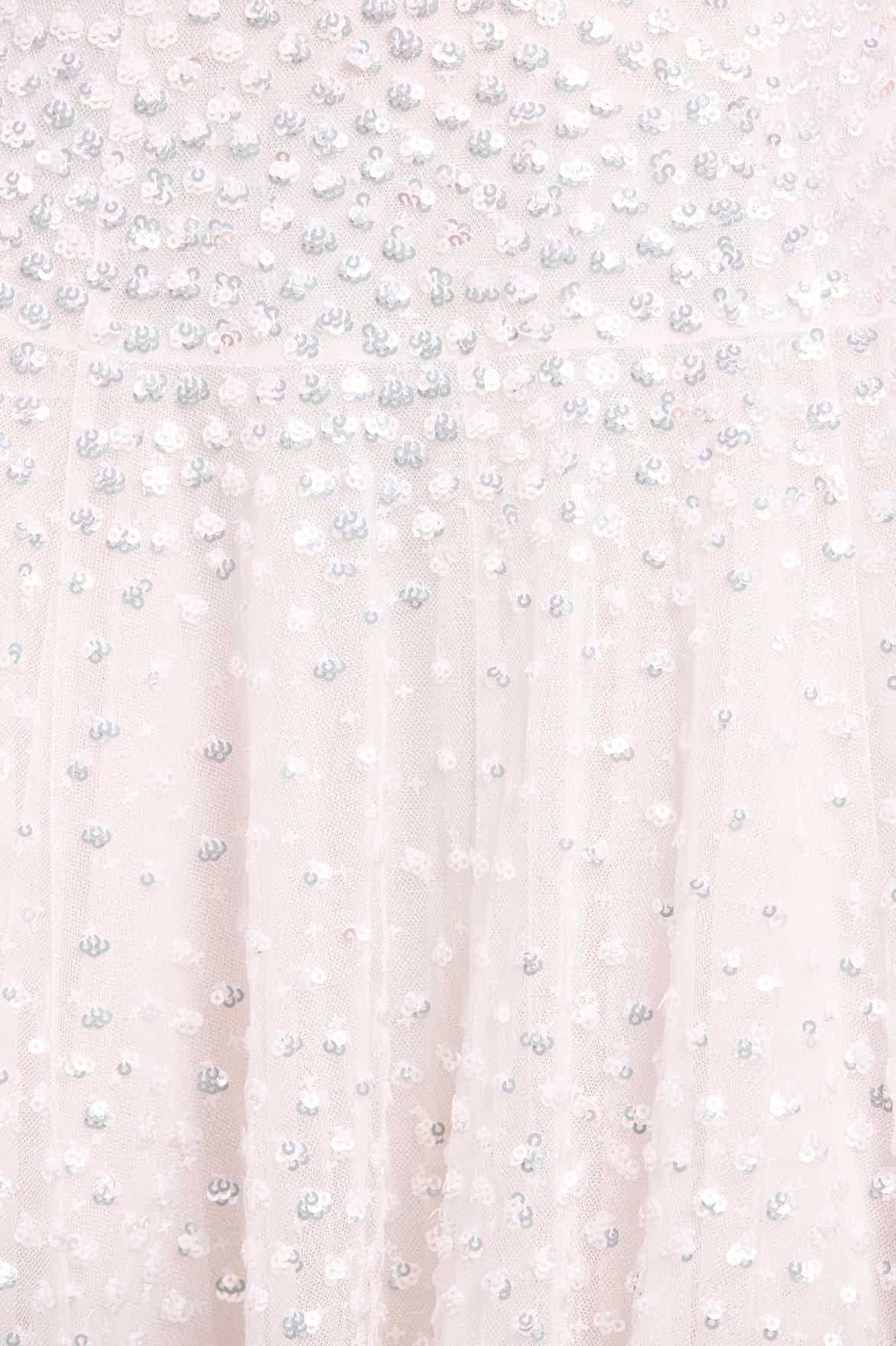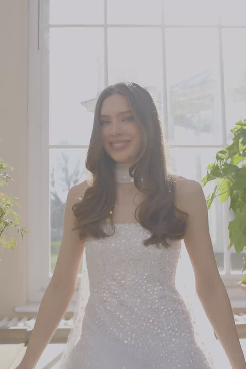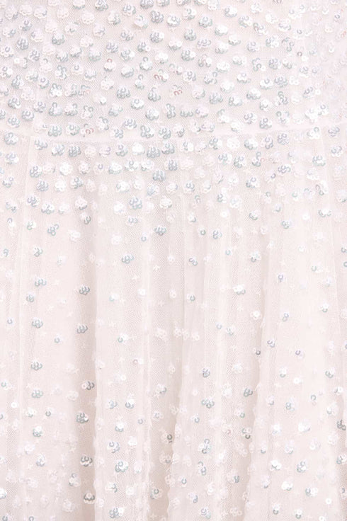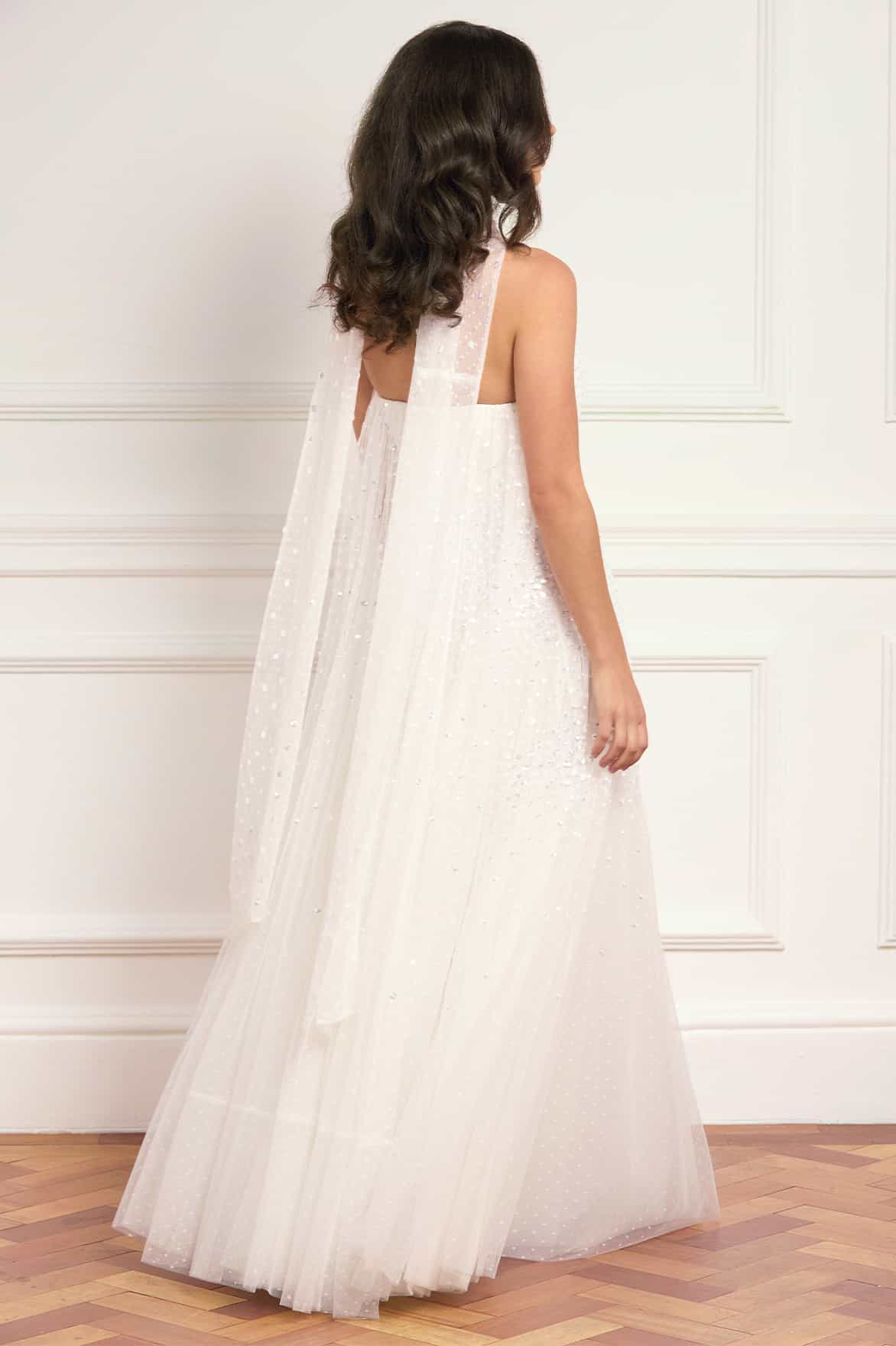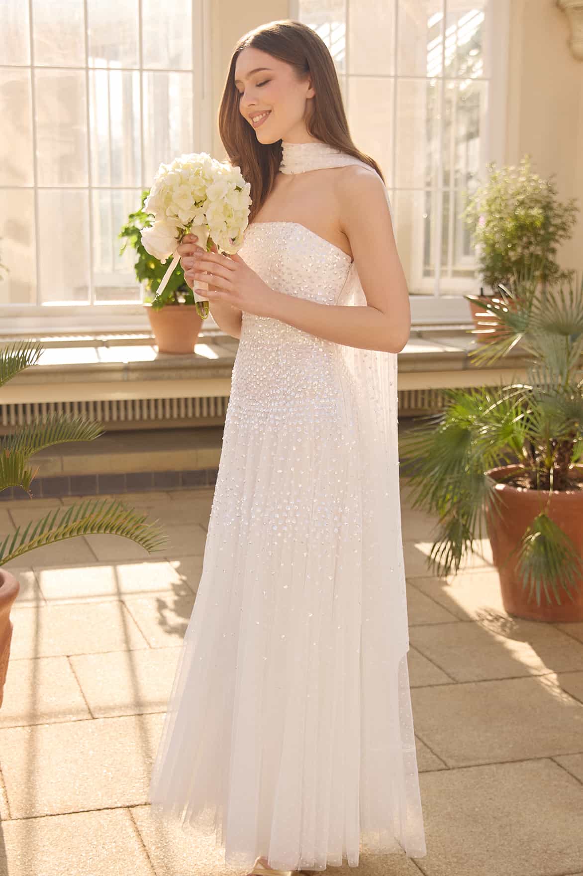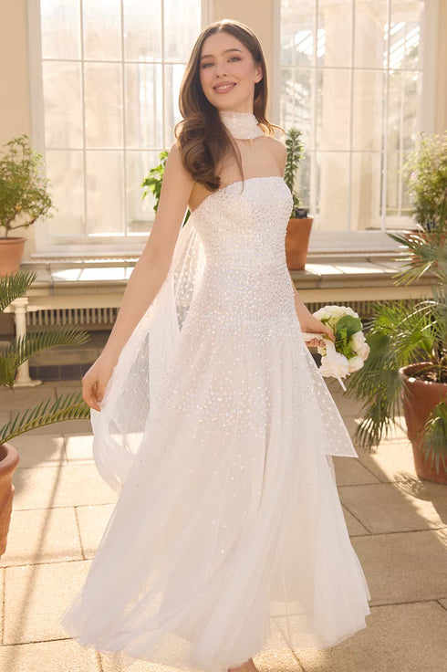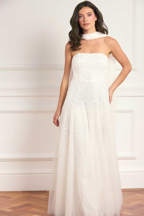 NEW SEASON. The Sunrise Sequin Strapless Cape Gown in Swan White. This elegant strapless gown is embellished with shimmering sequin dot motifs arranged in softly fading linear bands for a luminous finish. Designed with a delicately gathered tulle cape at the back, the flowing silhouette creates refined drama for evening occasions. Perfectly paired with a matching scarf.
