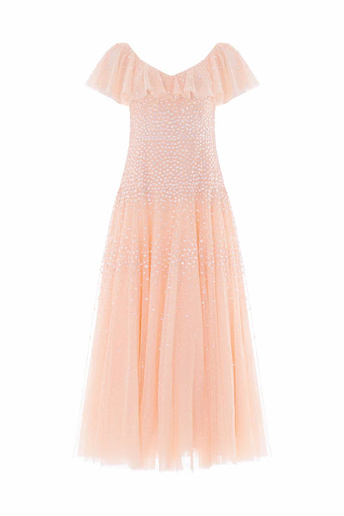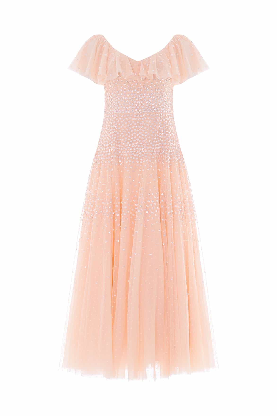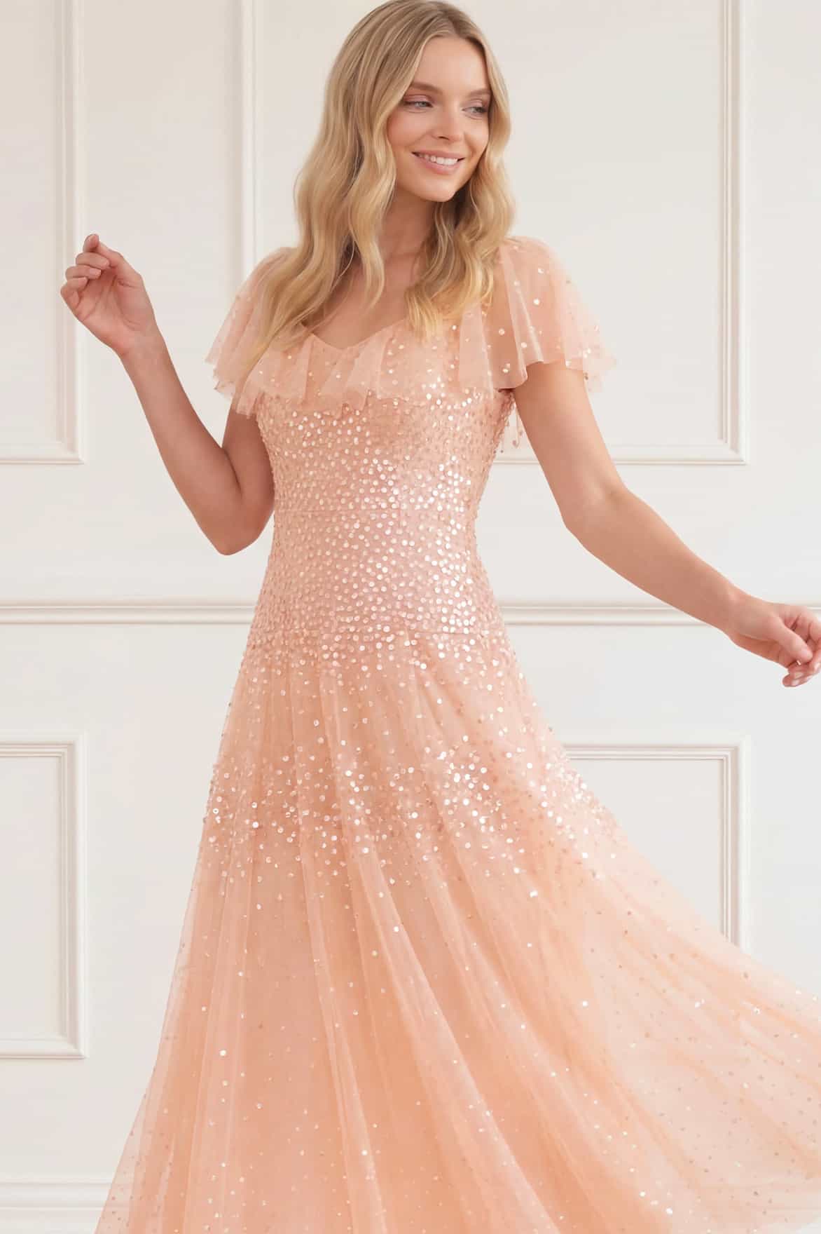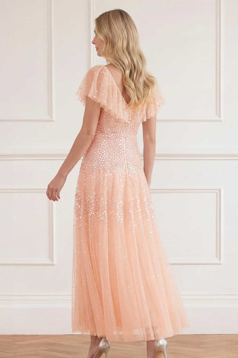 NEW SEASON. The Sunrise Sequin V-Neck Ankle Gown in Apricot Blush. Inspired by warm sunset tones, this V-neck ankle gown features delicate high-gloss sequin detailing that gently fades across the silhouette. The softly structured bodice flows into a fluid skirt for graceful movement.