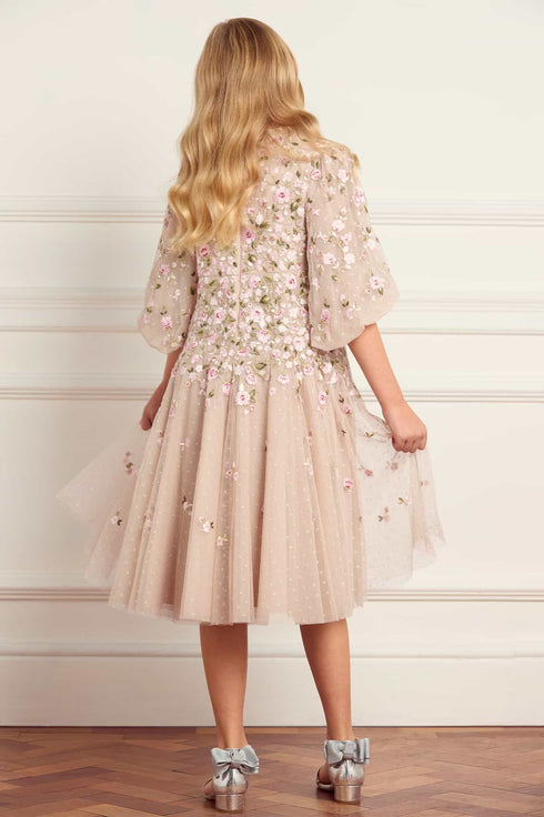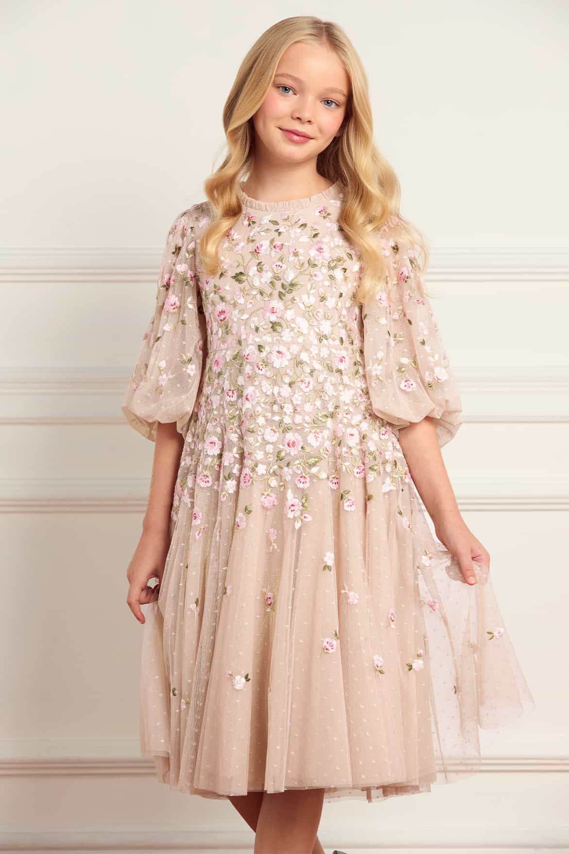 NEW SEASON. The Sylvia Rose Kids Dress in Oyster/Multi. A painterly interpretation of heritage florals. Crafted in layers of soft tulle, the dress is embroidered with delicate roses in multi-tonal threads scattered across an oyster base. The silhouette allows ease of movement while retaining Needle & Thread’s signature elegance. Pair with the Sylvia Rose Round Neck Ankle Gown in Oyster/Multi from the womenswear line for a coordinated family look that celebrates timeless romance.