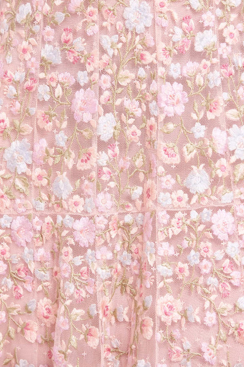 NEW SEASON. The Sylvia Rose Long Sleeve Ankle Gown in Peony Pink/Bright. Adorned with delicate floral embroidery cascading in softly graduated bands, this gown offers a romantic, engineered finish. Designed with long sleeves and an elegant ankle-length silhouette for refined occasion dressing.