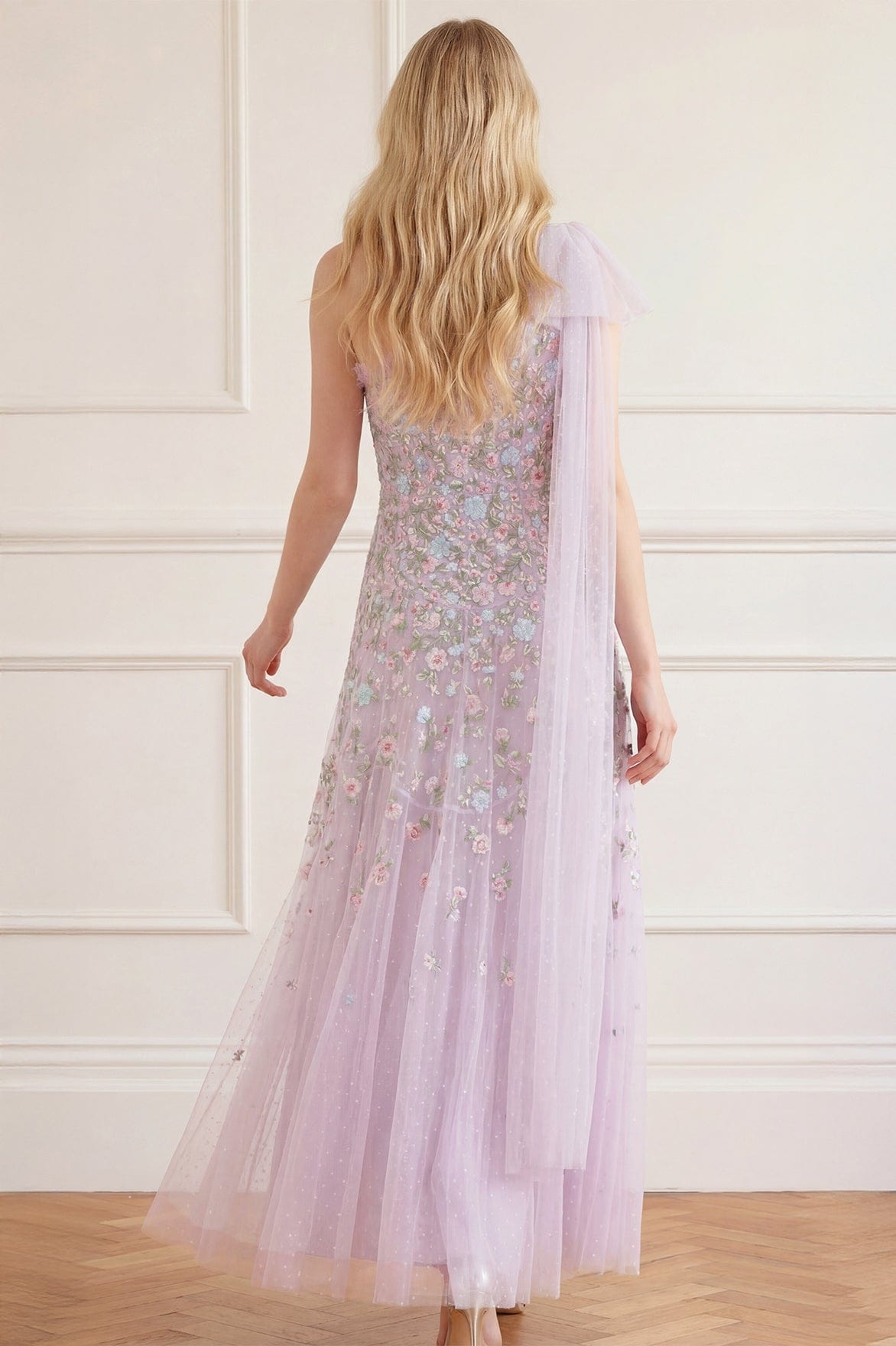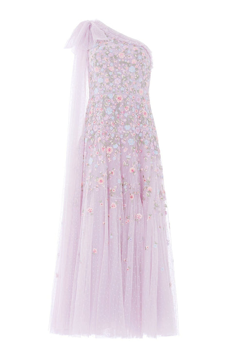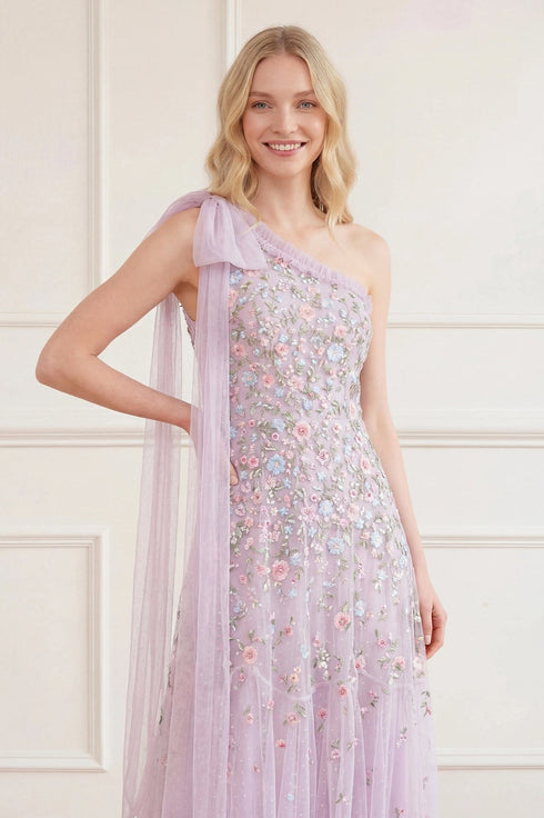 NEW SEASON. The Sylvia Rose One-Shoulder Bow Ankle Gown in Powder Lilac/Bright. This romantic gown features delicate floral embroidery arranged in softly graduated bands across the silhouette. Finished with a striking one-shoulder neckline and bow detail for an elegant statement.