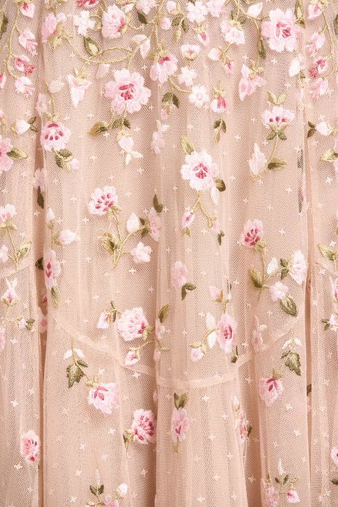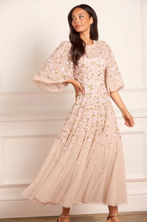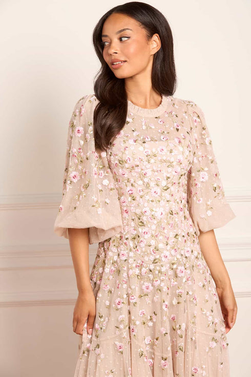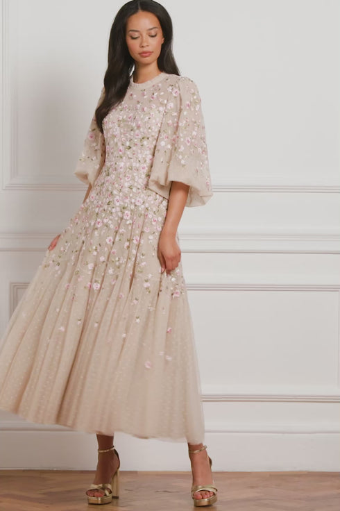 NEW SEASON. The Sylvia Rose Round Neck Ankle Gown in Oyster/Multi. Richly embroidered roses and scattered ditsy blooms adorn layers of tulle, softened by the luminous base. The gown’s slim silhouette and ankle length make it wearable yet impactful, while the multi-coloured embroidery evokes timeless artistry.