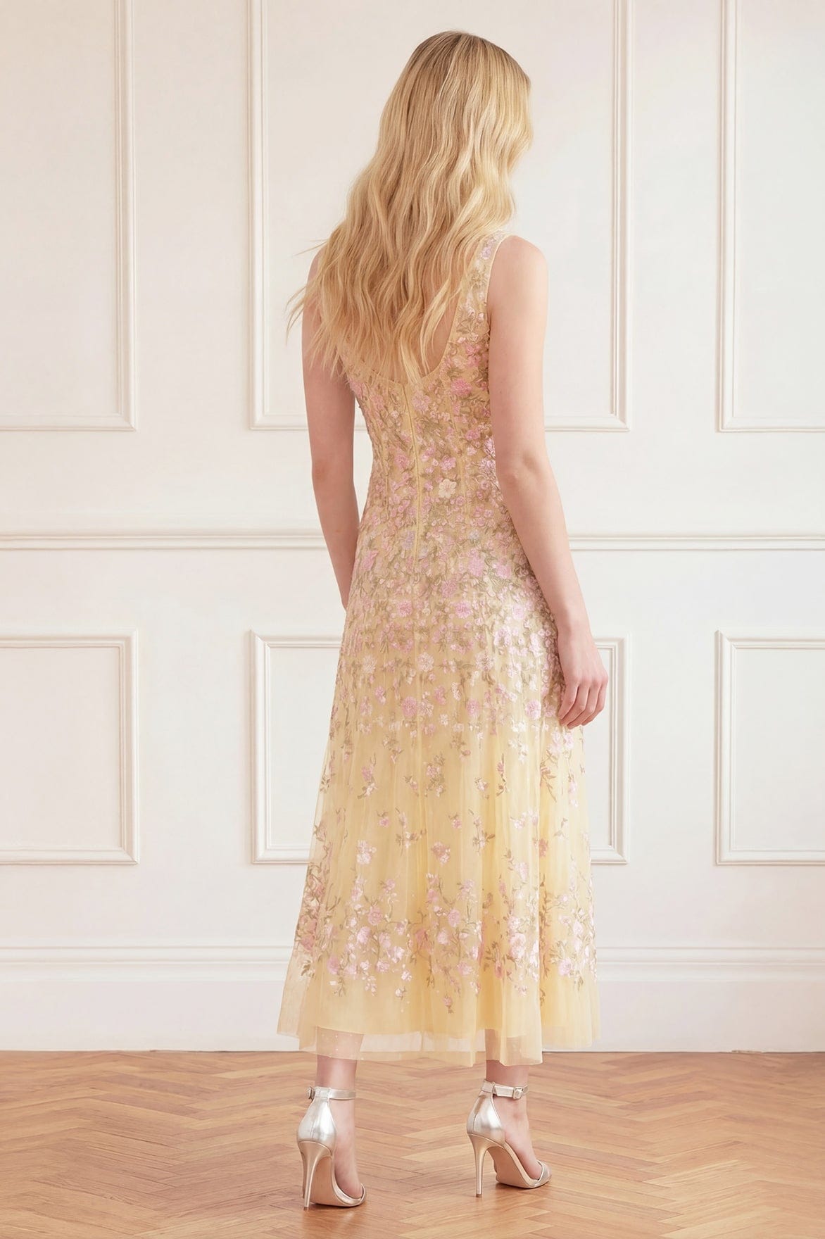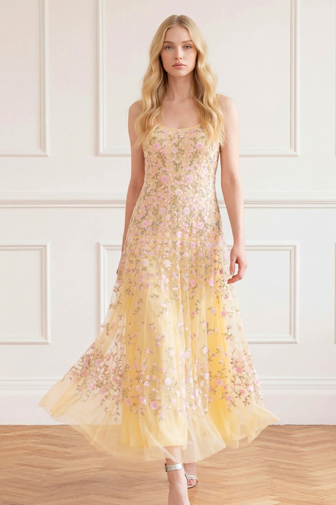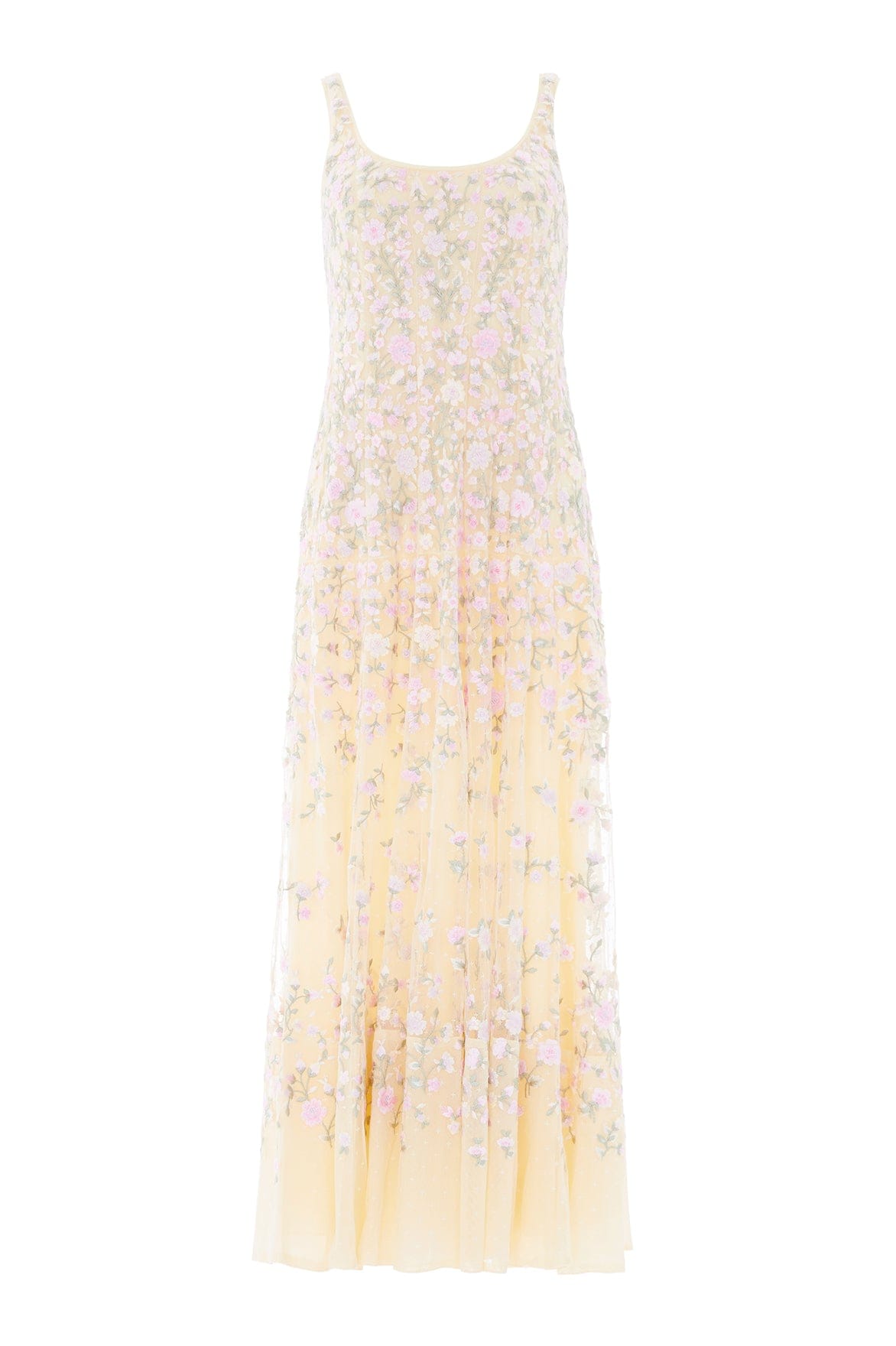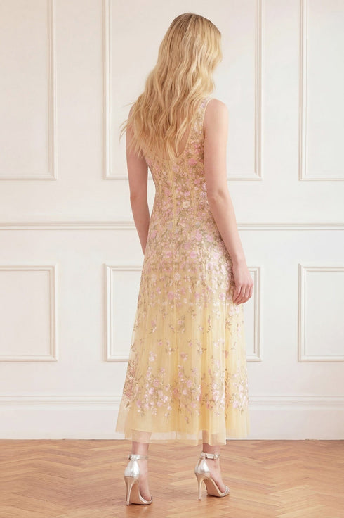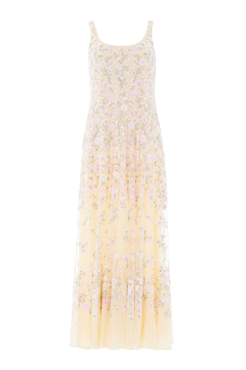 NEW SEASON. The Sylvia Rose Scoop Neck Ankle Gown in Lemon Sorbet/Pastel. An elegant embroidered gown featuring delicately engineered panelling for a flattering fit. Designed with a scoop neckline and a slim powermesh lining to gently enhance the silhouette with comfort and structure.