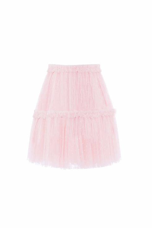 The Tulle Kids Skirt in Dusk Pink. The skirt is made up of generous layers of net and tulle with a sweeping hemline. This style has a tiered hem frill for extra frothy voluminous styling – perfect for twirling. Adorned with signature Needle & Thread frills at the waistband and skirt tier. Designed to be styled with our Emily Lace Georgette Bomber for the perfect statement party co-ord.